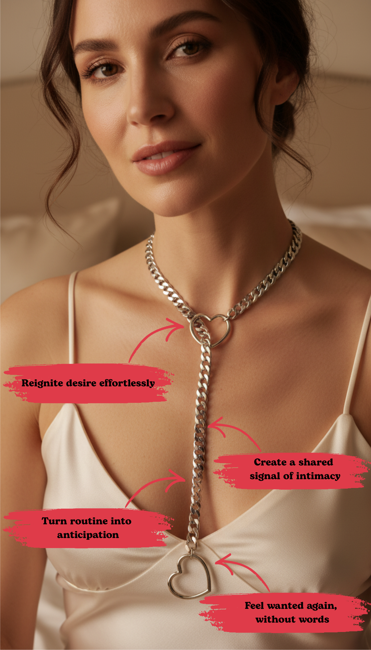 “Couples don’t lose desire. They lose rituals. This necklace works as a subtle cue for connection. It invites eye contact, playful tension, and a shared moment. I like it because it’s discreet, elegant, and it helps partners communicate closeness without words, turning routine nights into intentional nights.”